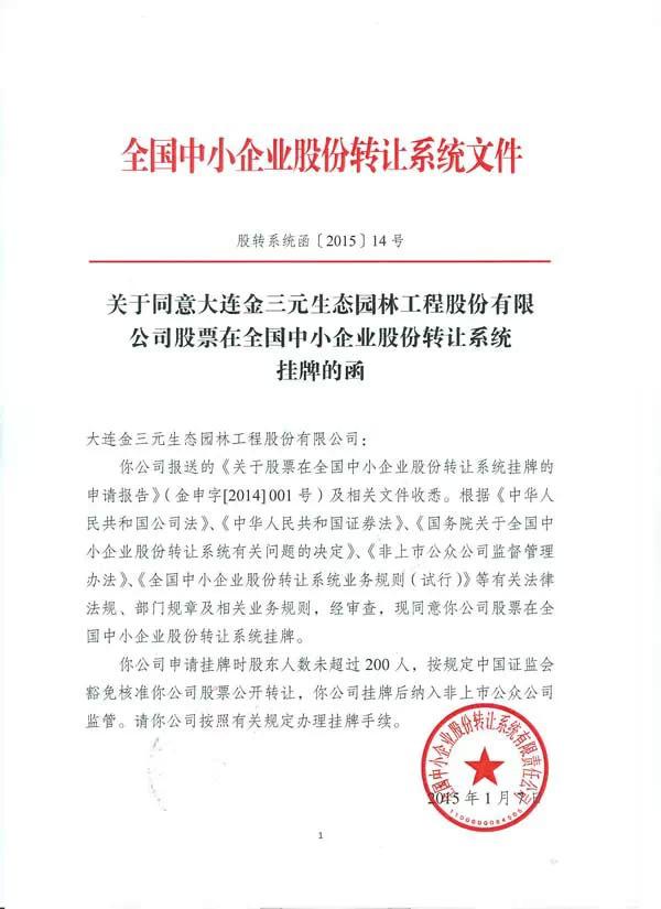 2015年1月7日,大連金三元生態(tài)園林工程股份有限公司在全國(guó)中小企業(yè)股份轉(zhuǎn)讓系統(tǒng)(又稱(chēng)新三板)成功掛牌,股票代碼:金三元831912,這標(biāo)志著金三元邁入了中國(guó)資本市場(chǎng)的快車(chē)道,進(jìn)一步夯實(shí)了企業(yè)發(fā)展的基石。