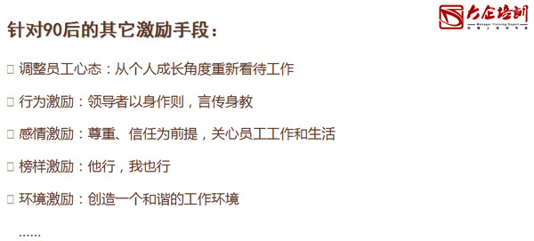 這就需要過程前移,先招到合適的人,再用適合的管理方式,從而降低人員流失率。薪酬激勵是必要手段,同時還是要增加其他方式,以滿足90后員工的需求。